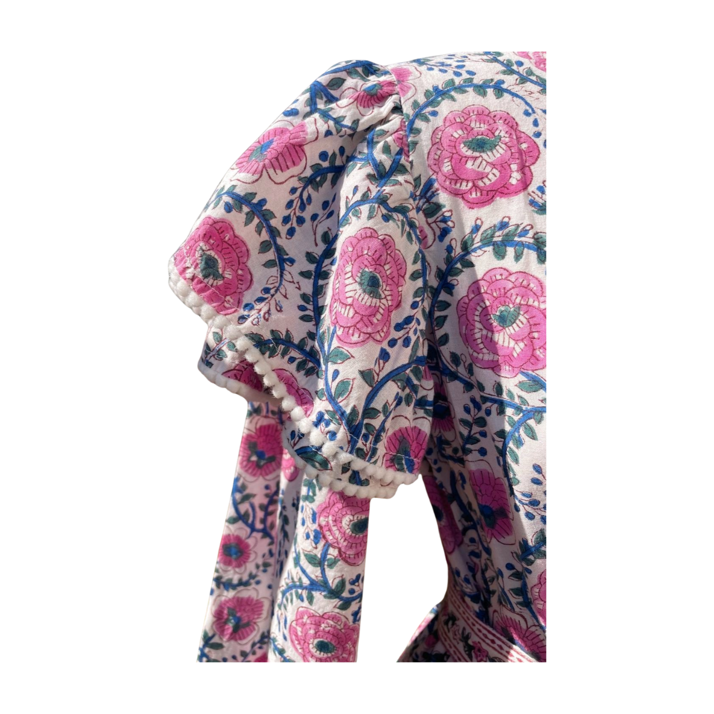 Introducing our Hannah Pom Pom Dress. This beautiful dress is made of 100% cotton, with double flutter sleeves and is offered in 3 vibrant prints. Handmade in Jaipur, India.
